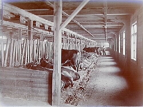 Ladugårdsinteriör, liggande och stående kor vid foderbordet.