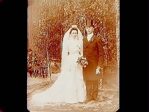 Brudpar, bruden helt i vitt, med slöja och krona, brudgummen i frack och hög hatt.