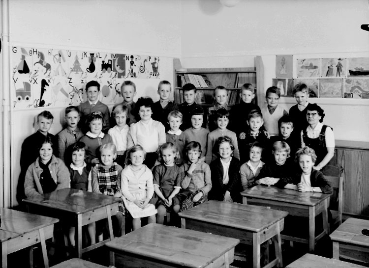 Klassrumsinteriör, 28 skolbarn med lärarinna.