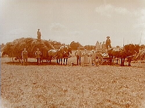 Skördearbete, 2 stycken höskrindor med 2 hästar. 10 personer.
