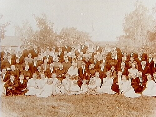 Bröllop. Brudpar och bröllopsgäster utomhus.
