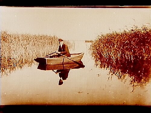 En man i en liten roddbåt.