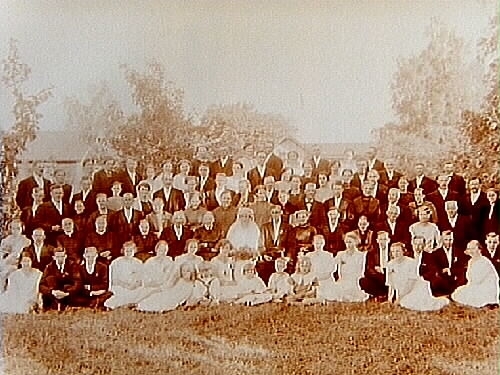 Bröllop. Brudpar och bröllopsgäster utomhus.