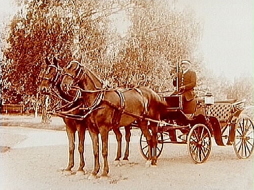 Kusk med ekipage, två hästar och fjädervagn.