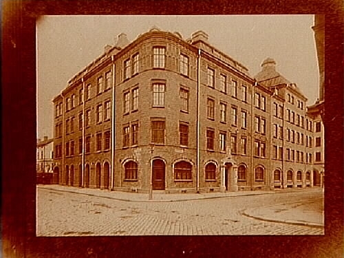 Johnson & Hill, fyra vånings fabriksbyggnad i rött tegel, med ett torn och tornhuvar. Fastigheten ligger dels vid Klostergatan - Fredsgatan - Gamla gatan.