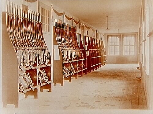 Interiör, hyllor fär gevär, patronbälten och ryggsäckar.