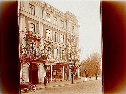 Fyra vånings bostadshus. Lindska Bokhandeln, Mälarprovinsernas Bank, S.V. Evers & Co, Handels & Transport AB.