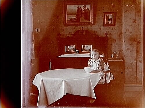 Familjebild, en liten flicka. Rumsinteriör.