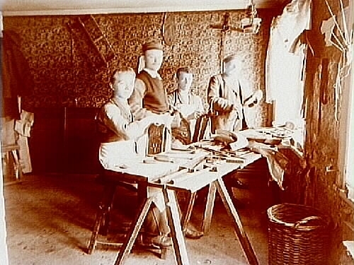 Rumsinteriör, fyra män vid arbetsbänken. Sadelmakeri Nygatan 30.