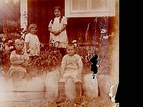 Titel: Fyra barn. Sam Lindskogs familjebild. Två bilder (8x8 cm) på samma glasplåt (8x17 cm).