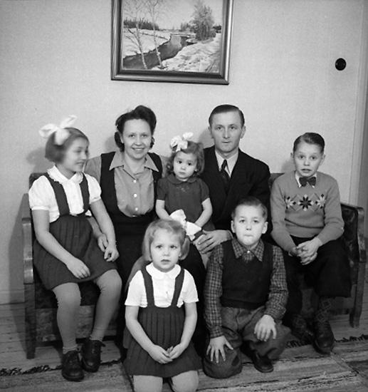 Personerna på bilden är: Orvar (född 1913), Svea (född 1918), Ebbe (född 1937), Inger (född 1938), Bernt (född 1940). Berit (född 1941), Barbro (född 1944).