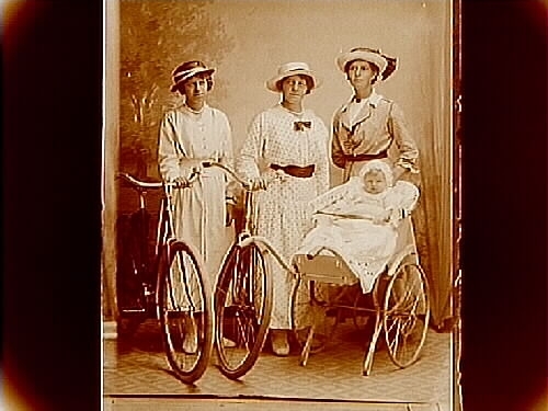 Två kvinnor med cyklar, en kvinna med en barnvagn med ett barn i.