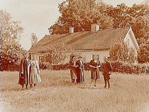 Bostadshus, sex personer framför huset.