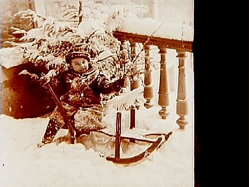 Familjebild, ett barn med släde.