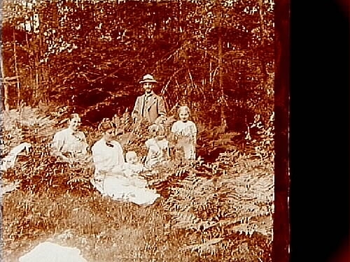 Titel: Familj, 6 personer i gröngräset. Sam Lindskogs familjebild. Två bilder på samma glasplåt.