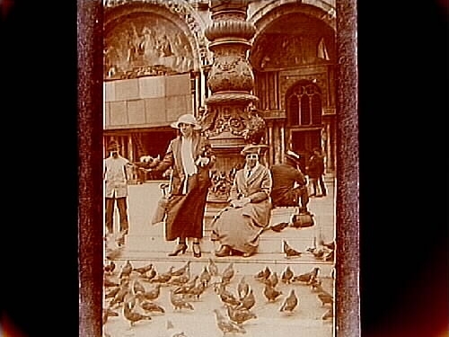 Två damer matar duvor.
