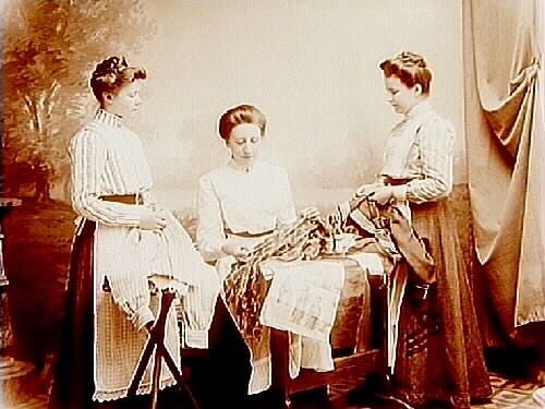 Tre kvinnor med sömnad.