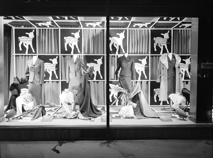 Jörnstedt, skyltfönster med damkläder och tyger av svenskt ylle.
