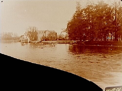 Hamnmotiv, tvåvånings hamnmagasin, en av Örebro båtarna, små ångslupar, så kallade "kolibrier" i Svartån.