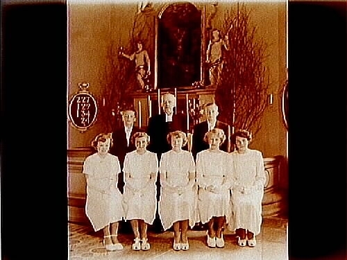 Konfirmander, 5 flickor, 2 pojkar och kyrkoherde Erhard Morén.