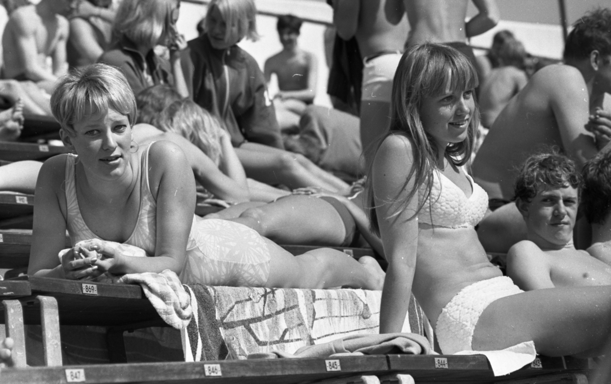 Ungdomar solar på läktaren på Gustavsviks utomhusbad. Närmast ligger en tonårsflicka på mage på en handduk klädd i en ljus baddräkt och blickar in i kameran. Nedanför henne sitter en annan tonårsflicka i vit bikini och bredvid henne sitter en tonårspojke och betraktar henne. Andra personer syns i bakgrunden.