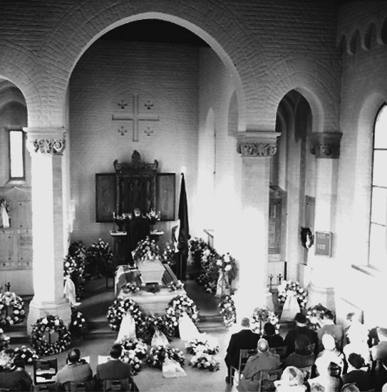 Vivi Karlbergs begravning, kyrkointeriör, begravningskista och begravningskransar.