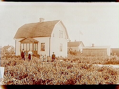 En och en halvvånings bostadshus med brutet tak och glasad veranda, familj 5 personer framför huset.