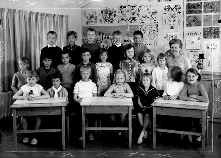 Lillåstrandskolan, klassrumsinteriör, 20 skolbarn med lärarinna fru Iréne Lagerqvist.