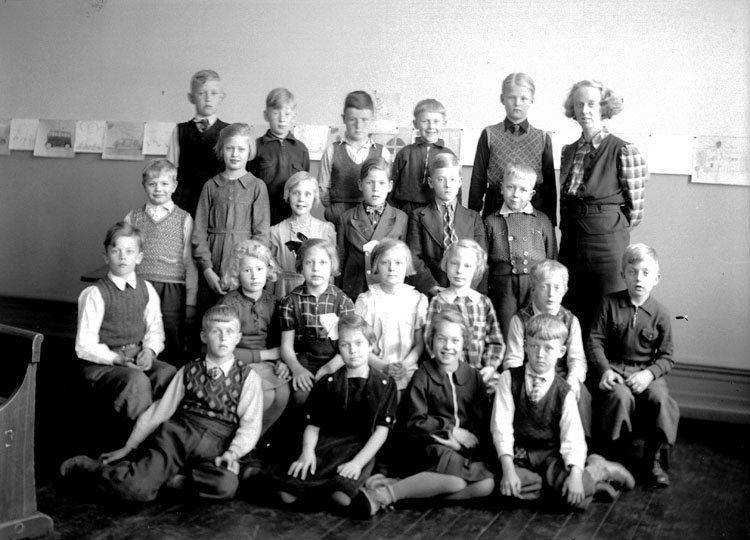 Vasaskolan, klassrumsinteriör, 7 flickor, 15 pojkar och lärarinna fröken Ella Jansson.