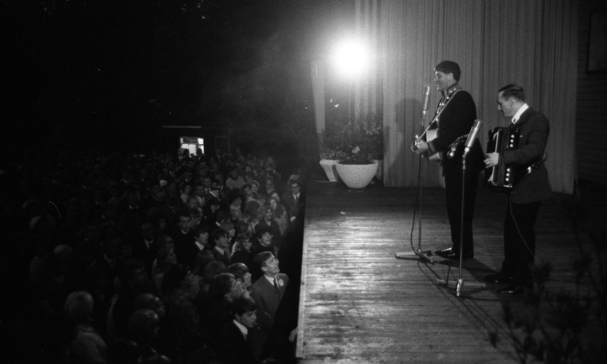 Jokkmokks-Jokke står på en scen och sjunger samt spelar gitarr klädd i samedräkt. En annan man klädd i kostym spelar dragspel bredvid honom. Publik står nedanför scenen och tittar på.