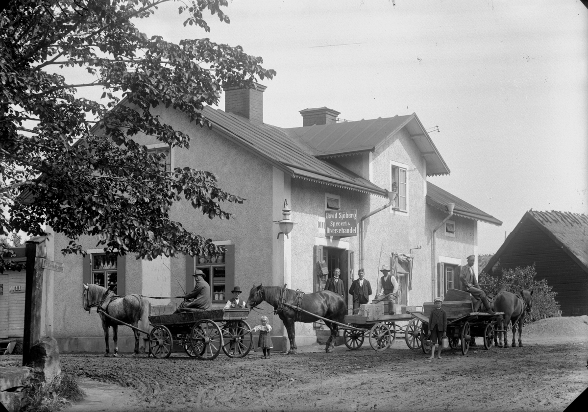 David Sjöbergs Speceri & Diversehandel, hästar spända för vagnar, åtta personer.