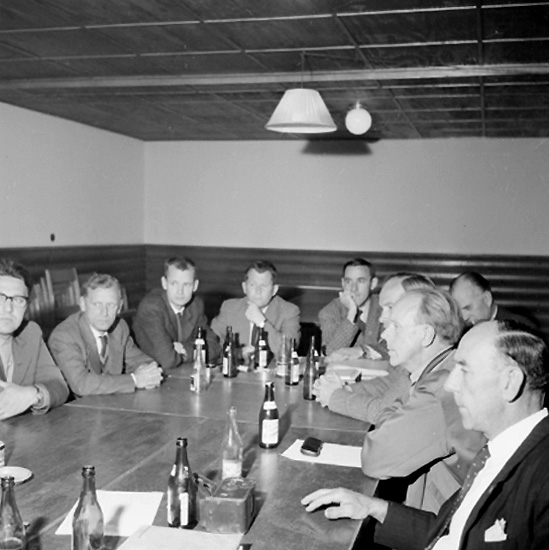 Rumsinteriör, grupp vid bordet.
