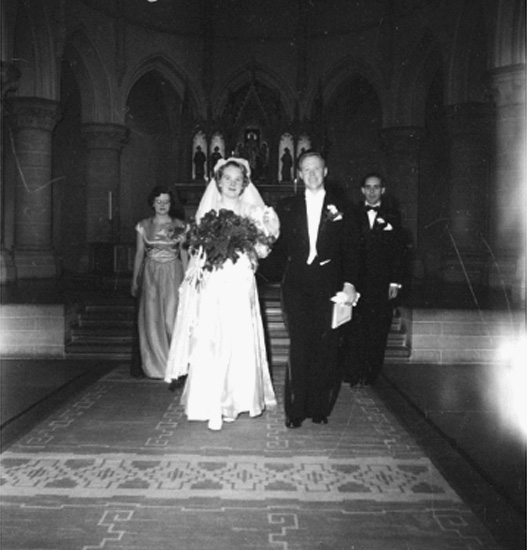 Kyrkointeriör, bröllop, brudpar och ett par.