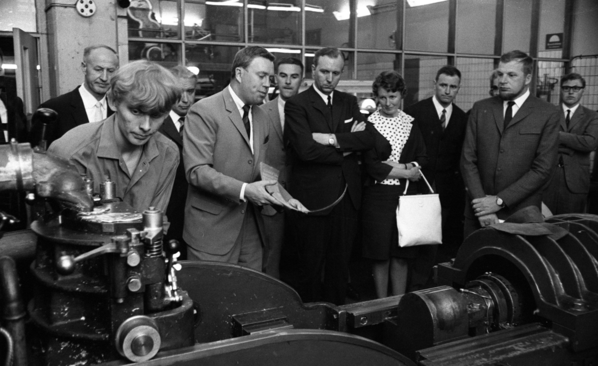 En man i ljus kostym, vit skjorta och mörk slips håller i en tryckmall för tidningar och berättar om tryckeriverksamheten för en grupp åhörare som står i bakgrunden. Han står invid en tryckpress. Bredvid honom står en man i ljus skjorta och mörka byxor. En kvinna ur åhörarskaran bär en svart dräkt med prickig blus och har en vit handväska på vänstra armen.