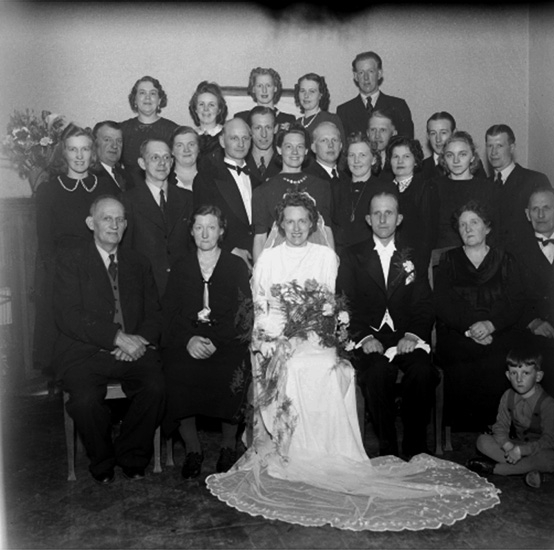 Interiör, bröllop, brudpar och bröllopsgäster.