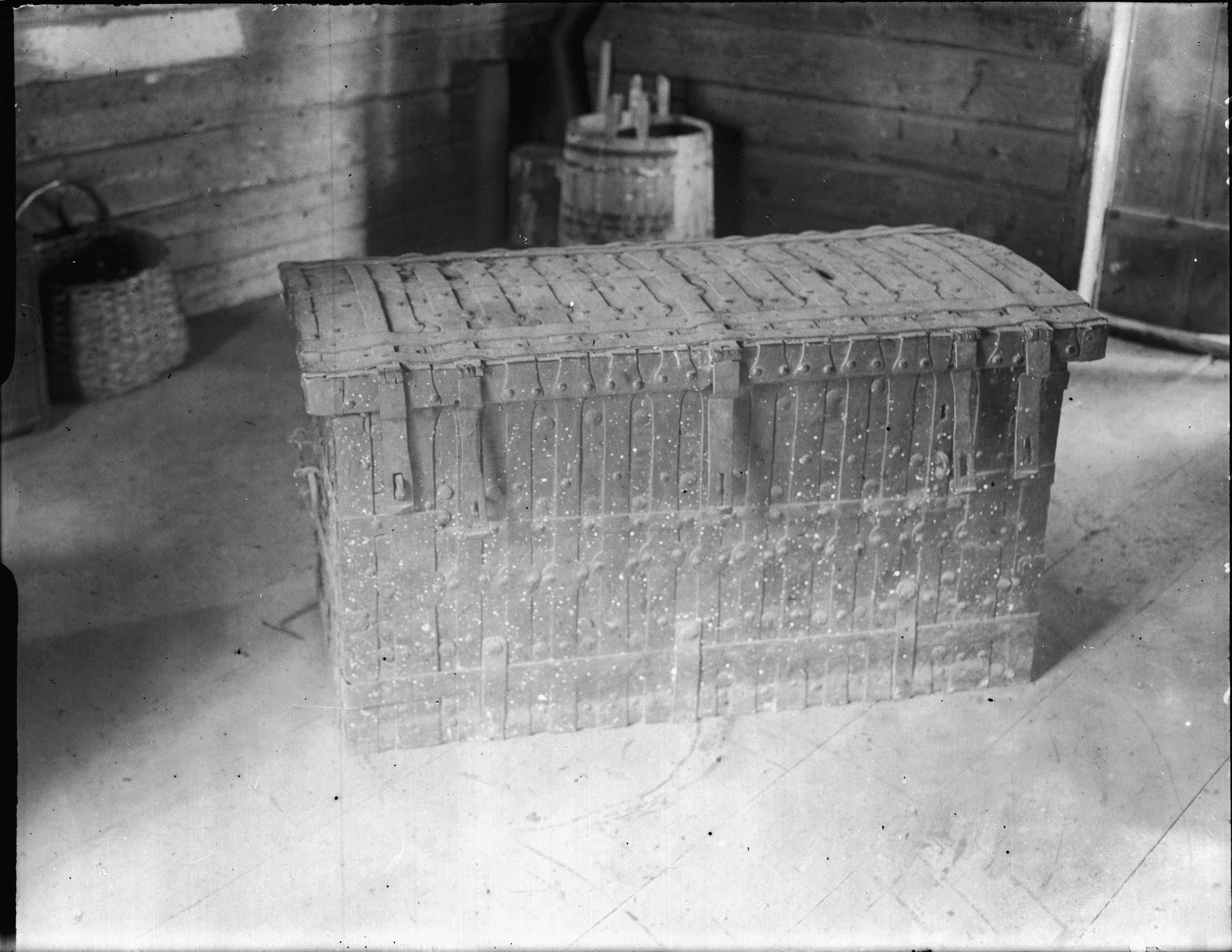 Offerkista av trä, klädd med järnplåt, 1700-tal. Snabbinv.