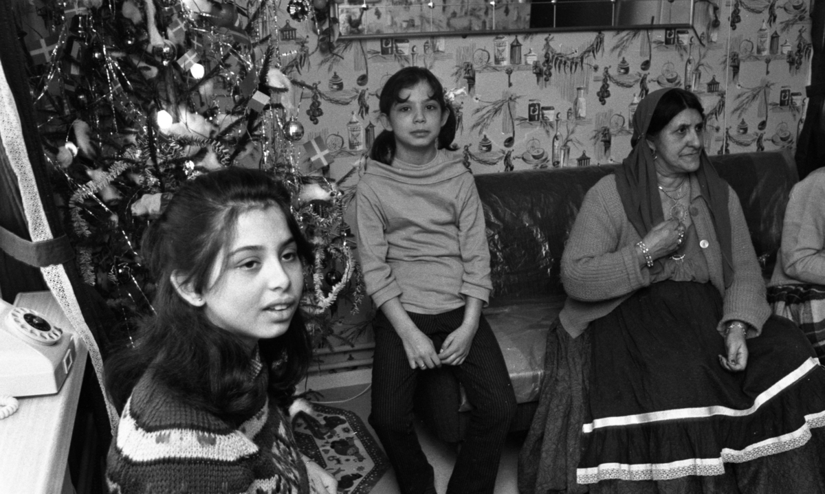 Några av familjen Karaskos kvinnliga medlemmar. Modern sitter i soffan i traditionell romsk dräkt. Bredvid henne sitter en till kvinna vars ansikte ej kommit med på bild. Den ena dottern sitter på soffans karm och den andra sitter närmast kameran. I bakgrunden till vänster syns den dekorerade julgranen. En vit telefon står på fönsterbrädan till vänster i bild.
