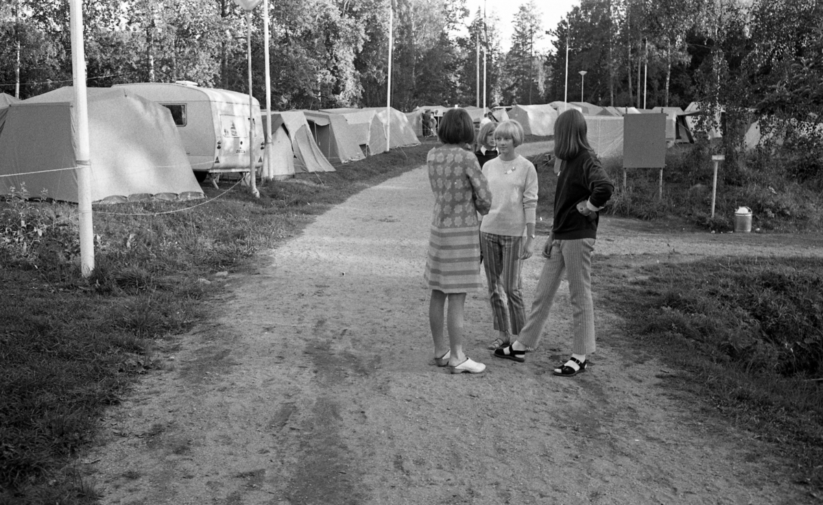 Tre ungdomar står och samtalar på en väg på ett missionsläger. I bakgrunden syns en husvagn samt en massa tält. Den unga flickan till vänster bär en kort klänning samt träskor, flickan i mitten är klädd i tröja, byxor och sandaler medan flickan till höger är klädd i tröja, byxor, sandaler och strumpor. Ytterligare personer syns i bakgrunden.