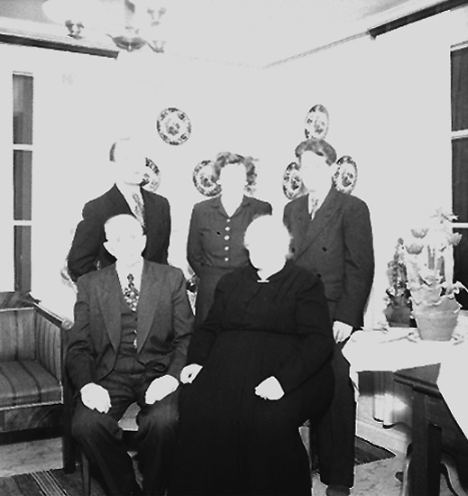 Titel: Rumsinteriör, släktgrupp fem personer. Fru Schölins födelsedag.