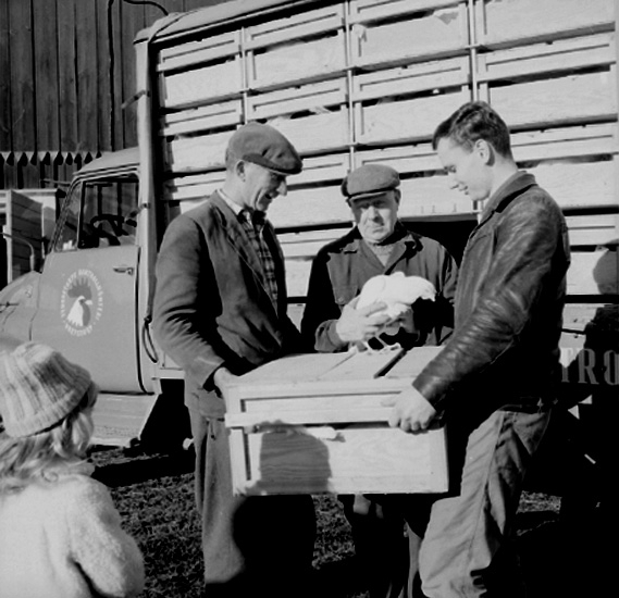 Stubbetorps Kontrollhönseri, lastbil och fyra personer.