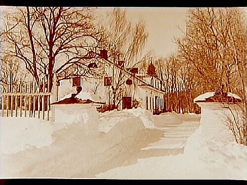 Sörby Säteri, envånings bostadshus med inredd vind, två flygelbyggnader, allèn upp till huset. Vinterbild.