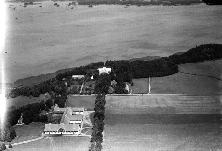 Flygfoto över Hjälmarsbergs Herrgård, tvåvånings herrgårdsbyggnad, bostadshus och ekonomibyggnader.