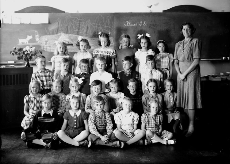 Olaus Petriskolan, klassrumsinteriör, 25 skolbarn med lärarinna fröken Anna Thyresson.