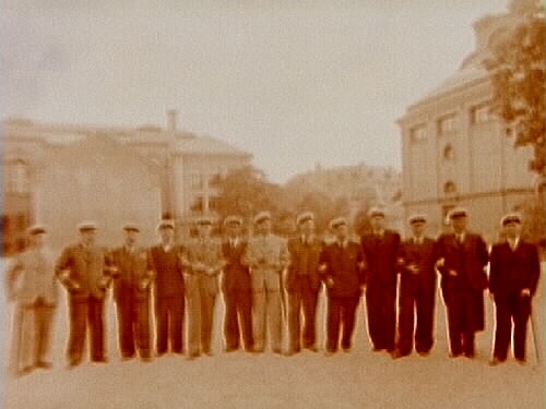 Karolinska läroverket, kamratmöte, 13 herrar på skolgården och på skolmuseét.