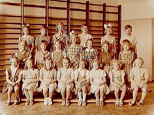 Engelbrektsskolan, klassrumsinteriör, 21 skolbarn med lärarinna fru Agda Borgell, klass 2, sal 4.