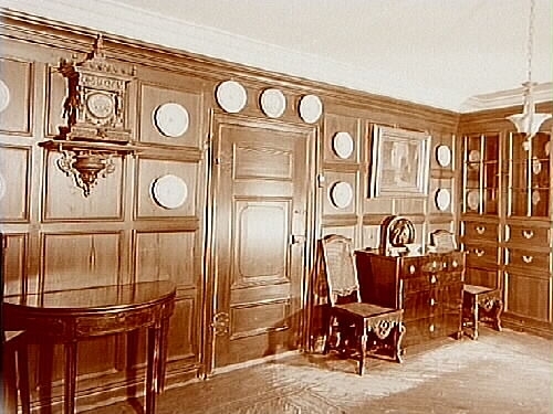 Julita gård, inredning av matsalen i flygelbyggnaden, väggparti, bord, byrå, skåp och stolar.
