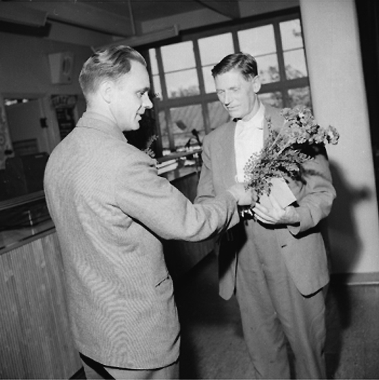 Rumsinteriör, två män, Oscarias pensionärer. Avtackning.