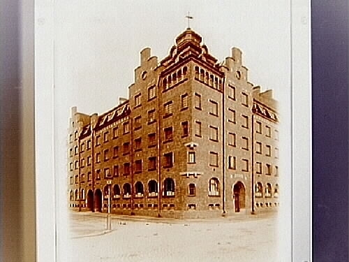 Grosshandelsfirman AB A.P. Åberg & Co., femvånings fabriksbyggnad i tegel med brutet tak, hörnfastighet.
