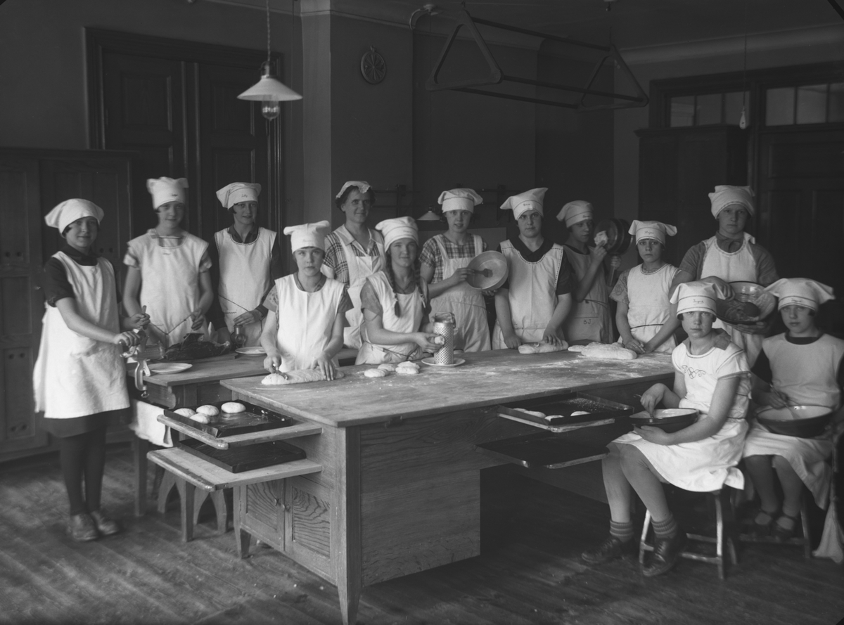Trädgårdsskolan (Nikolaiskolan), interiör av skolköket, 12 flickor.