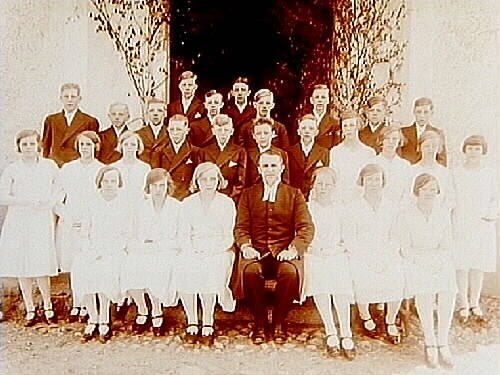 Konfirmander, 13 flickor, 14 pojkar och prästen.